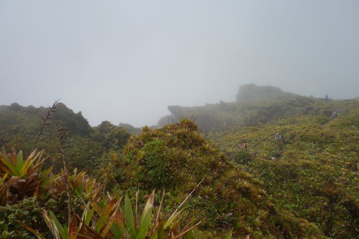 Cette partie est un peu glissante et complètement dans le brouillard. Je suis content de retrouver du monde au refuge pour finir l’ascension avec eux, on se sent plus en sécurité. L’un d’eux vient du second centre UCPA de l’île et, n’appréciant pas les activités, a loué une voiture pour faire de la rando avec sa famille (restée en-dehors du cratère). Pique-nique au sommet avec très peu d’éclaircies, je termine même mon sandwich sous une pluie battante… On redescend avec précaution, ça glisse encore plus qu’à la montée ! Pas de chance donc, je ne pourrais pas admirer la vue une nouvelle fois…