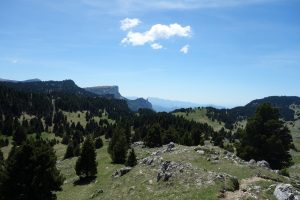 Encore 400 m de montée et on atteint le sommet du Grand Veymont avec, surprise, une superbe vue sur le mont Aiguille et les plateaux avoisinants. Le spot idéal pour manger face à ce paysage, sans trop de monde aux alentours sinon quelques si ce n’est quelques oiseaux noirs au bec jaune qui nous tournent autour et veulent piquer nos chips et sandwichs.