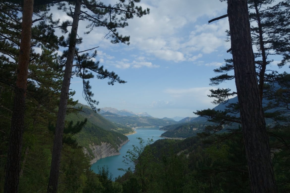 Descente de la colline en passant par un champ suite Ă une mauvaise lecture du balisage jaune, alternance de montĂ©es et de descentes presque au bord du lac dans la forĂȘt avant d’atteindre la passerelle du Drac, un poil plus longue (220m, pour la mĂȘme hauteur). J’applique la mĂȘme technique et passe sans soucis de l’autre cĂŽtĂ©, pour poursuivre le chemin sur quelques centaines de mĂštres et trouver une vue dĂ©gagĂ©e (et accessoirement un banc pour soulager mon genou…)
