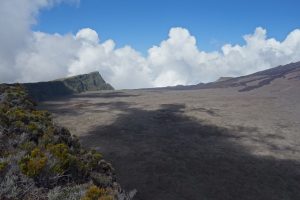 Cette approche nous permet d’arriver au bord de l’ (immense) enclos Fouqué, à environ 150m au-dessus du fond, et ainsi découvrir petit à petit le Piton de la Fournaise.