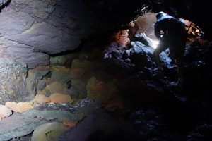 Visite surprise : il faut chausser nos lampes frontales pour descendre dans un tunnel de lave juste à côté. Ce conduit en pente douce, d’environ 1m50 de diamètre formé par une coulée de lave se refroidissant à l’extérieur à l’air libre. L’île en est truffée. Expérience hautement étrange de se trouver là-dedans, mais c’est une magnifique construction de la nature.