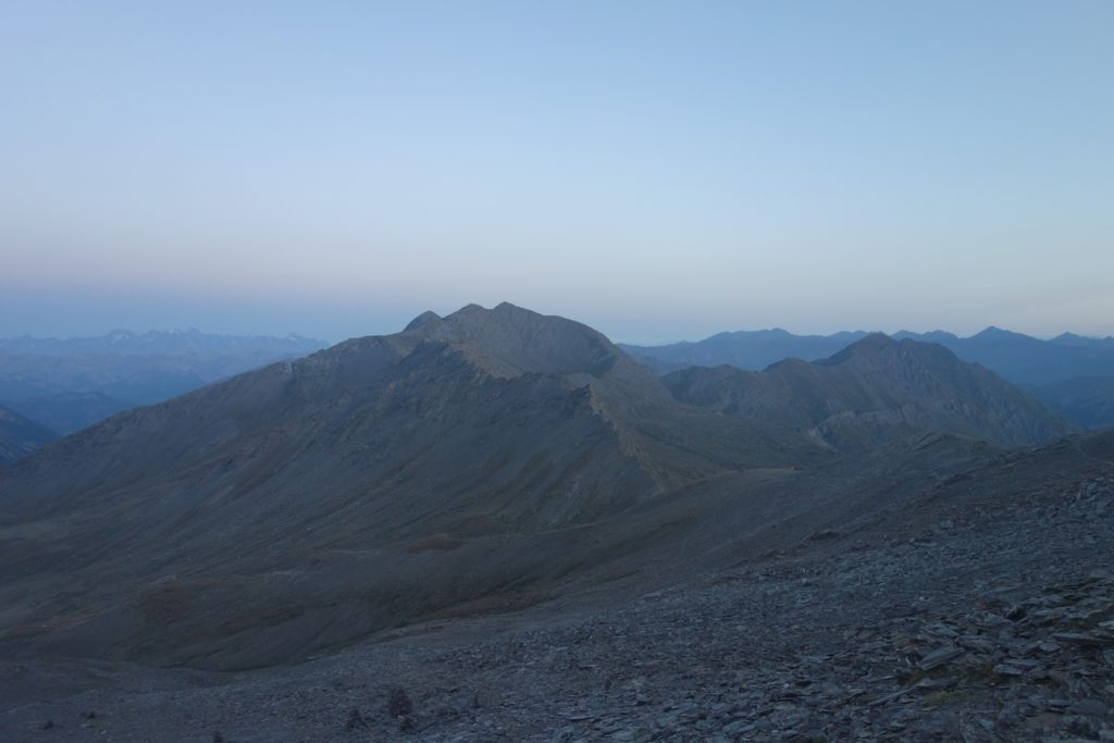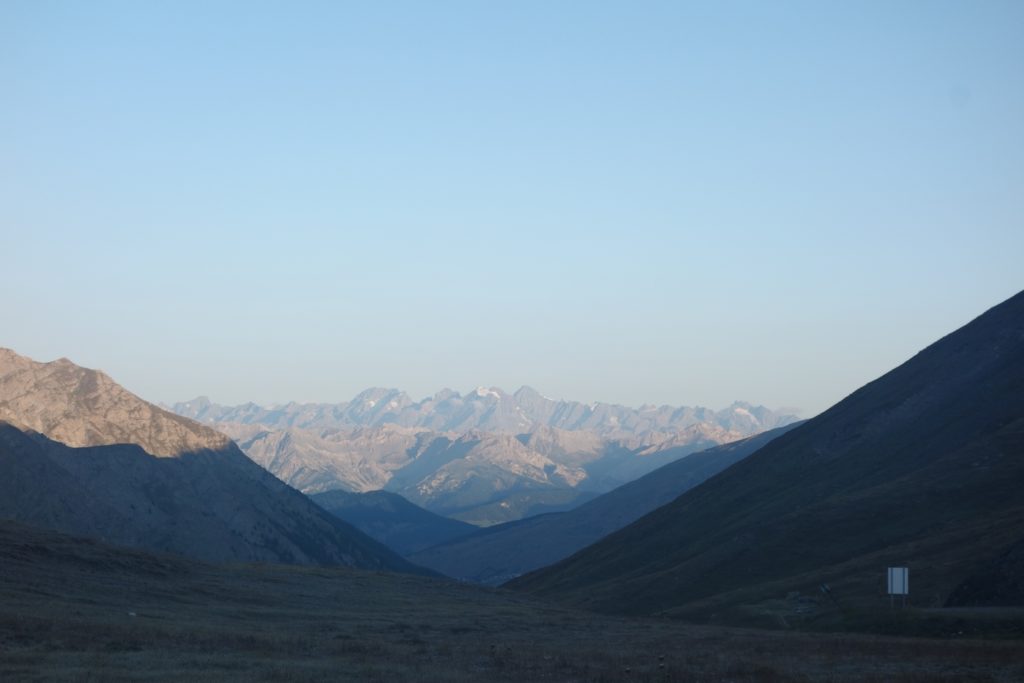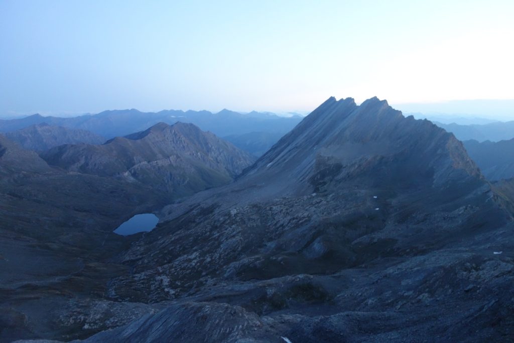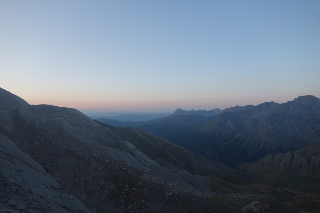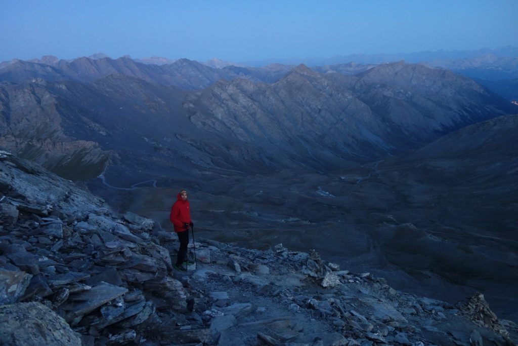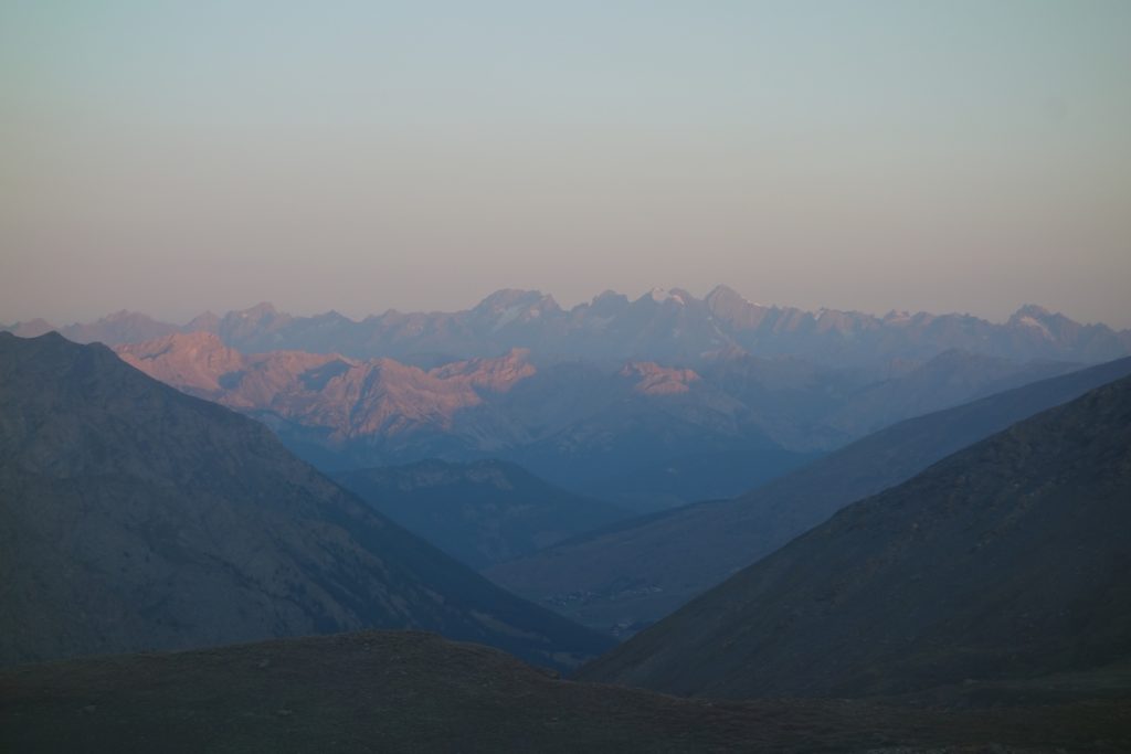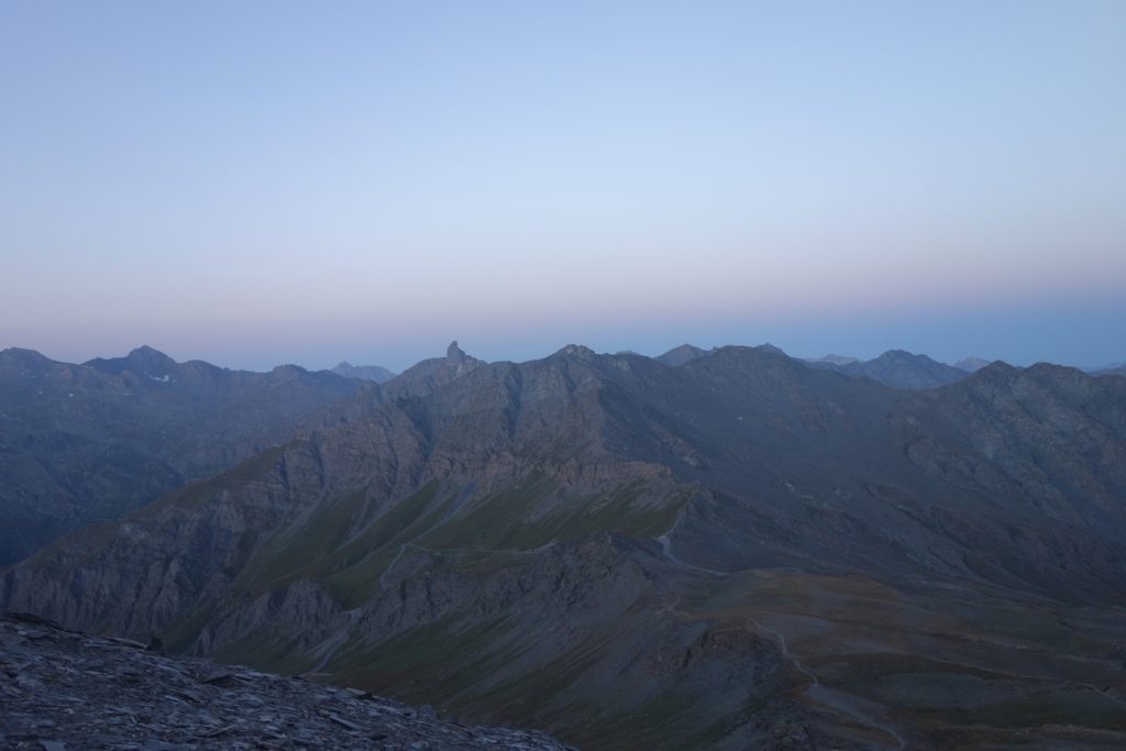 Les premières lueurs de l’aube apparaissent autour du Mont Viso et nous permettent de voir qu’une nouvelle fois, l’Italie est sous les nuages, ce qui nous cachera le lever de soleil sur l’horizon et le retardera d’autant. On profite tout de même du moment : le ciel étoilé est magnifique et on se sent vraiment au bout du monde tout seuls là-haut à 3200.