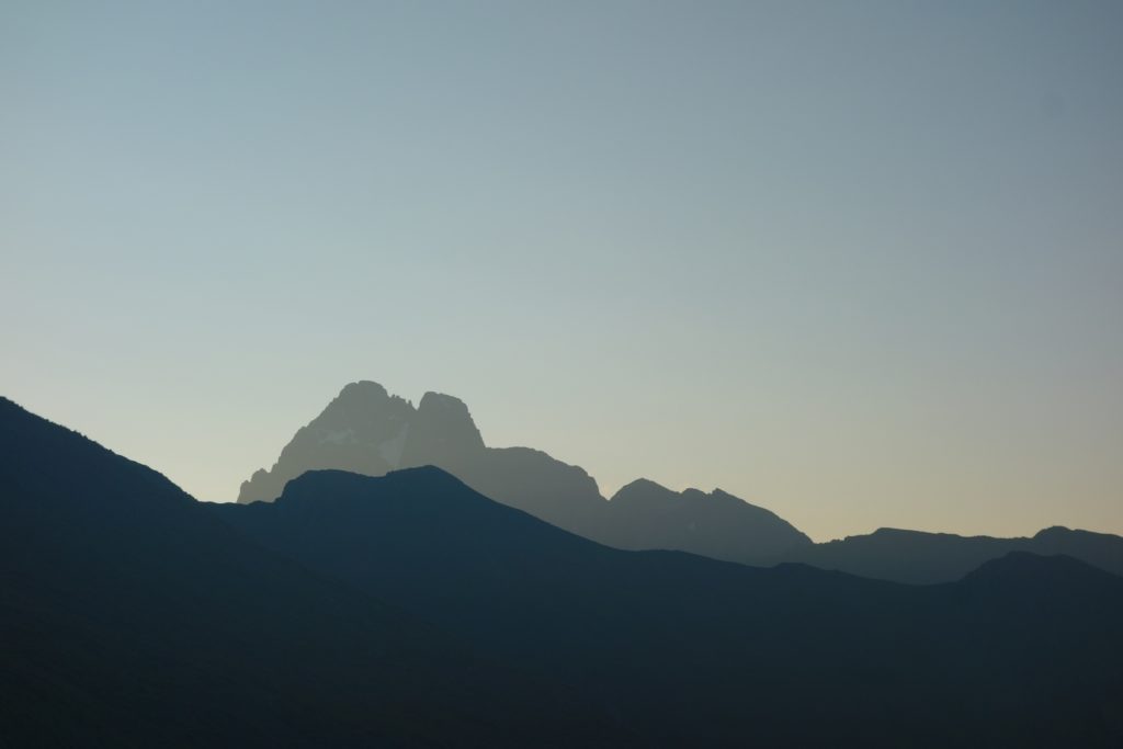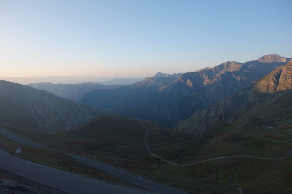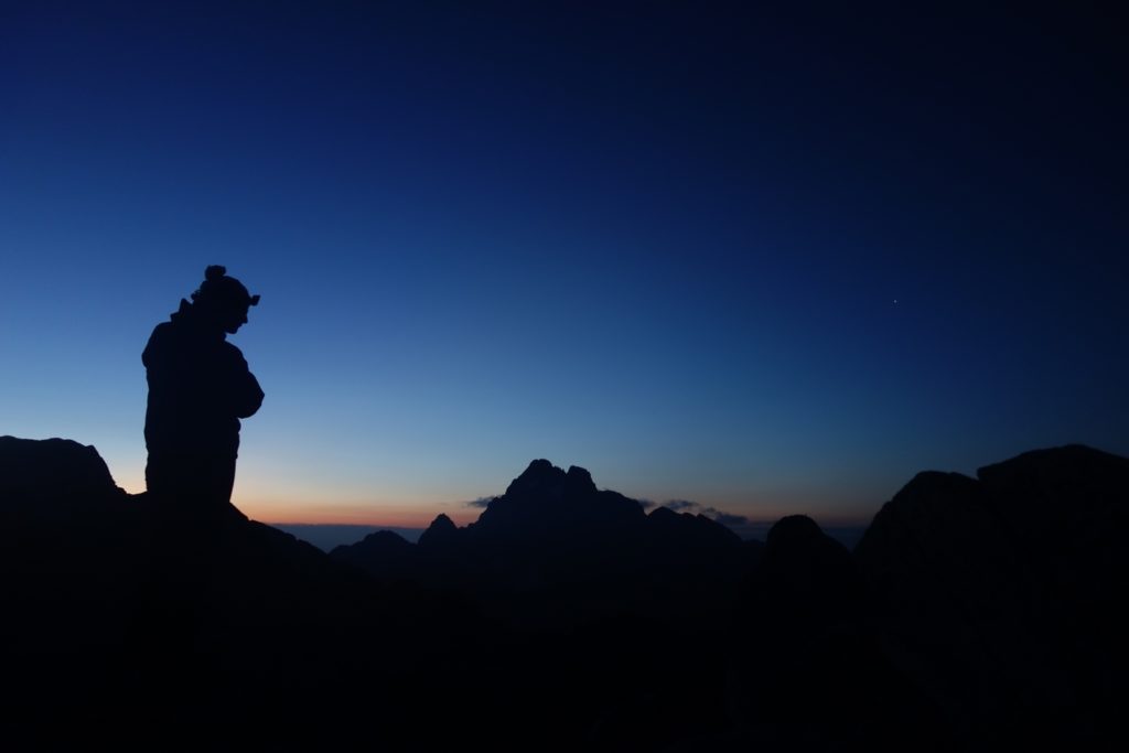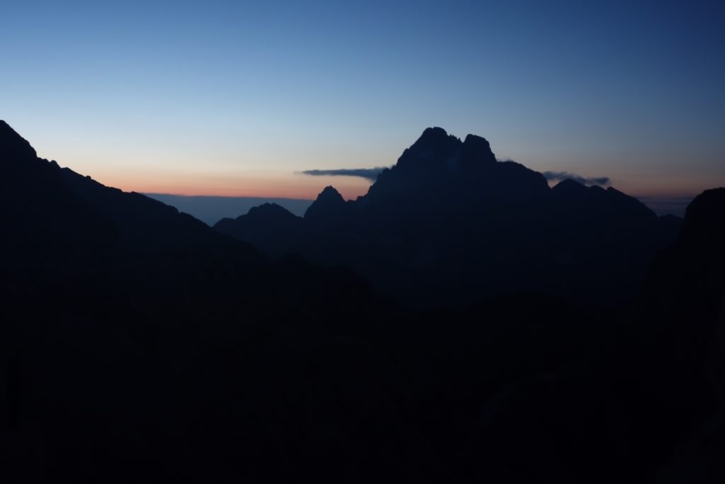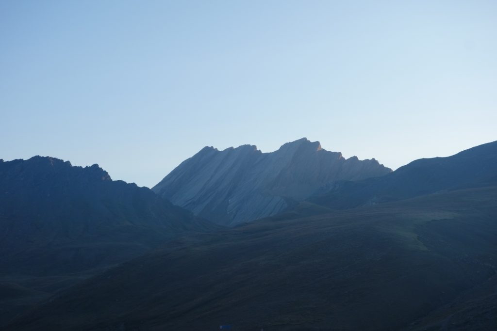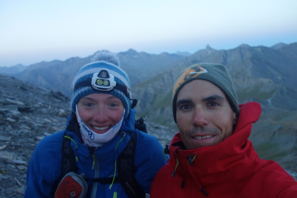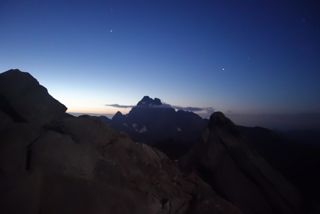 Les premières lueurs de l’aube apparaissent autour du Mont Viso et nous permettent de voir qu’une nouvelle fois, l’Italie est sous les nuages, ce qui nous cachera le lever de soleil sur l’horizon et le retardera d’autant. On profite tout de même du moment : le ciel étoilé est magnifique et on se sent vraiment au bout du monde tout seuls là-haut à 3200.