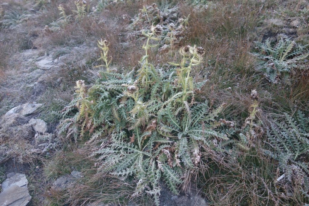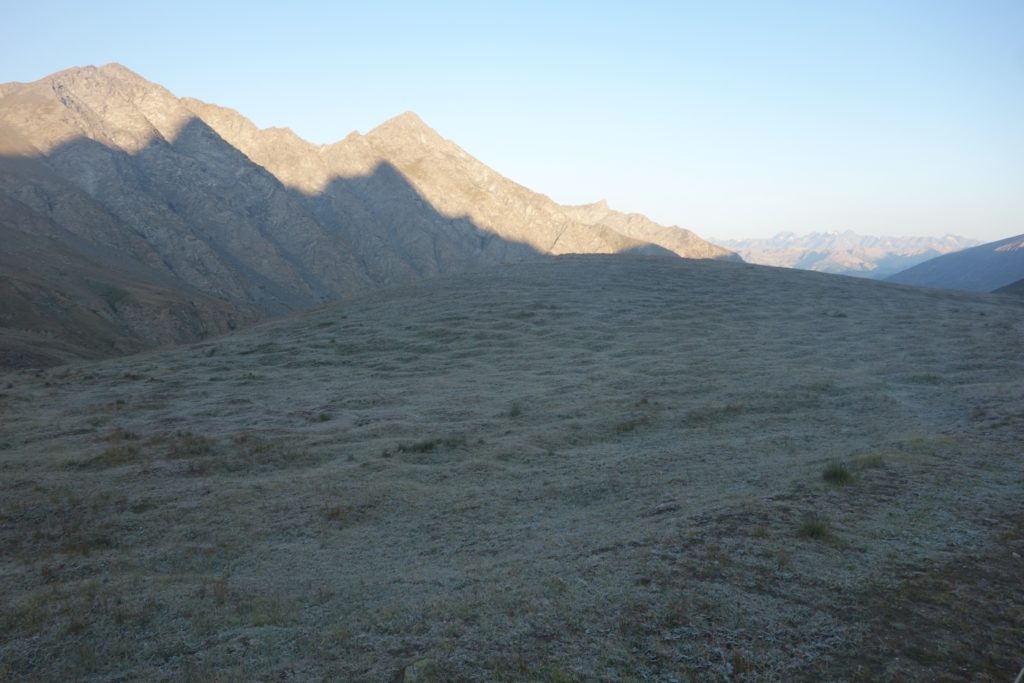 La réalité des températures nous fait prendre le chemin du retour avant que les sommets ne reçoivent la lumière matinale. On redescend tranquillement en essayant de retrouver le sentier de l’aller : il y a des pistes et cairns un peu partout, et certains emmènent vers une partie de désescalade que je souhaite éviter. L’endroit est moins vertigineux que je ne le craignais malgré une belle vue plongeante sur les 3 vallées qui l’entourent.