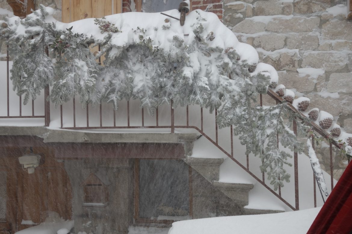 Lever au petit matin, j’ouvre les rideaux pour aérer un peu la chambre mais me rends vite à l’évidence que ça serait risquer une mini-avalanche. Le vent a soufflé toute la nuit et formé de sacrées congères tout autour de la maison.