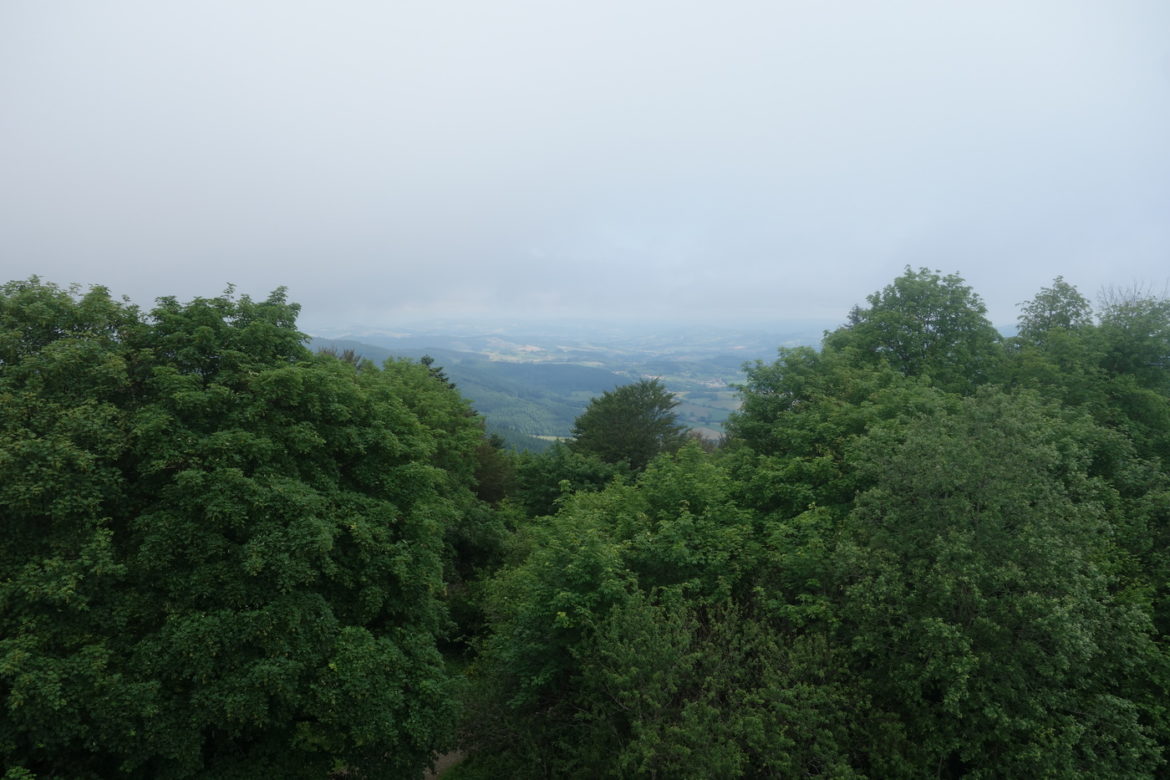Arrivé à notre sommet départemental, et en haut de la structure permettant (normalement) d’admirer la vue alentours, je me rends à l’évidence que je suis cuit et qu’il est plus prudent de me rabattre sur la petite boucle. Peu de monde sur le sentier, j’ai juste doublé un groupe de randonneurs et une petite famille au sommet.