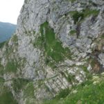 Une petite pluie fine s’invite. Le chemin longe le pied de la falaise avant de grimper et faire quelques lacets. Le passage humide – plus qu’une cascade, c’est un faible écoulement d’eau) n’est pas très long mais surtout assez large. Il y a un peu de vide mais le terrain est rassurant. Seuls quelques mètres se font sur une roche un peu lisse et humide où il faut faire attention.
