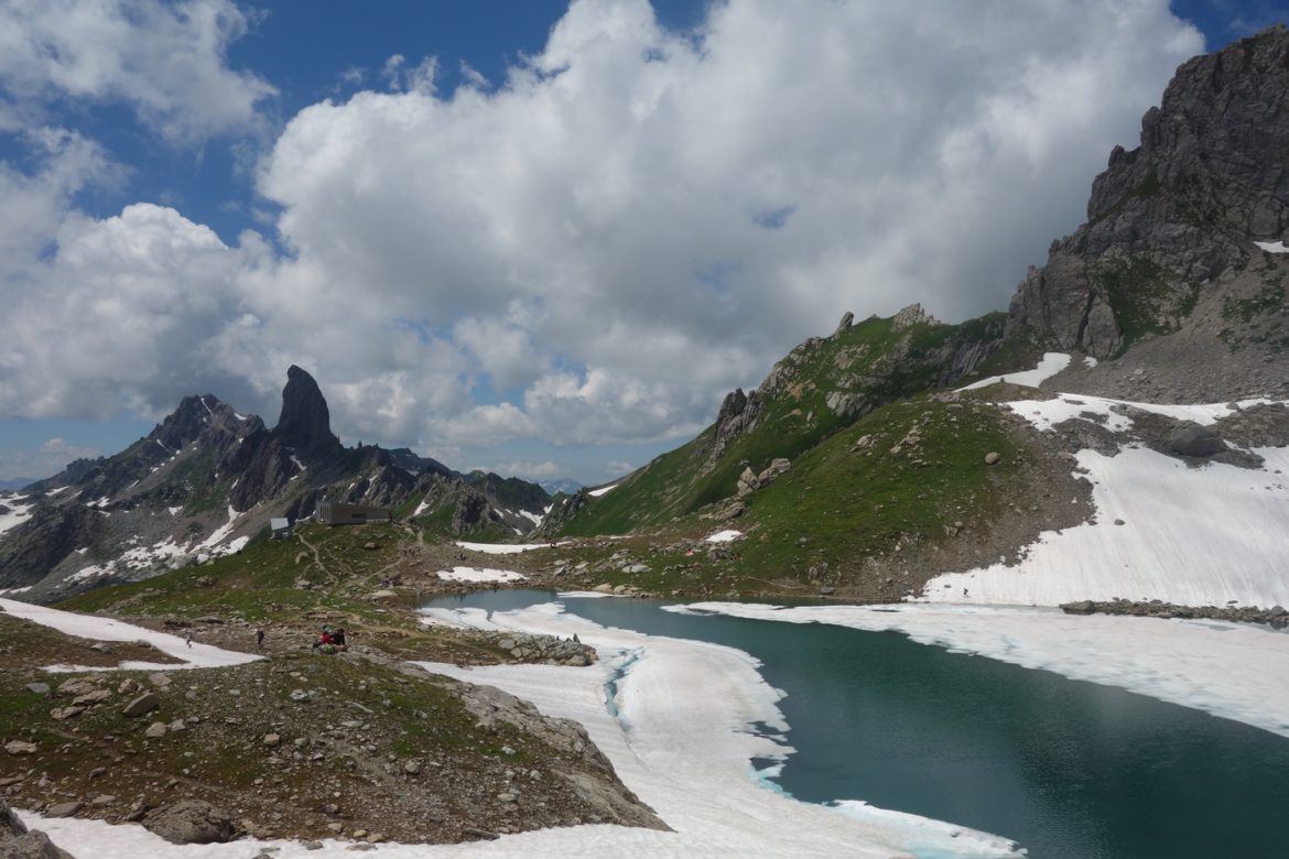 On termine l’ascension. Le temps s’est malheureusement bien couvert, nous empêchant de voir le Mont-Blanc, bien dégagé ce matin. Il reste encore énormément de neige au col du Grand Fond, à presque 2.700m. La montée, ça va encore, mais côté descente, elle couvre bien 200m de dénivelé de la vallée. On descend la première section, assez raide, sur les fesses avant de terminer debout sur la trace bien marquée. Les nombreuses personnes en itinérance avec leur gros sac n’ont pas la même facilité à passer.