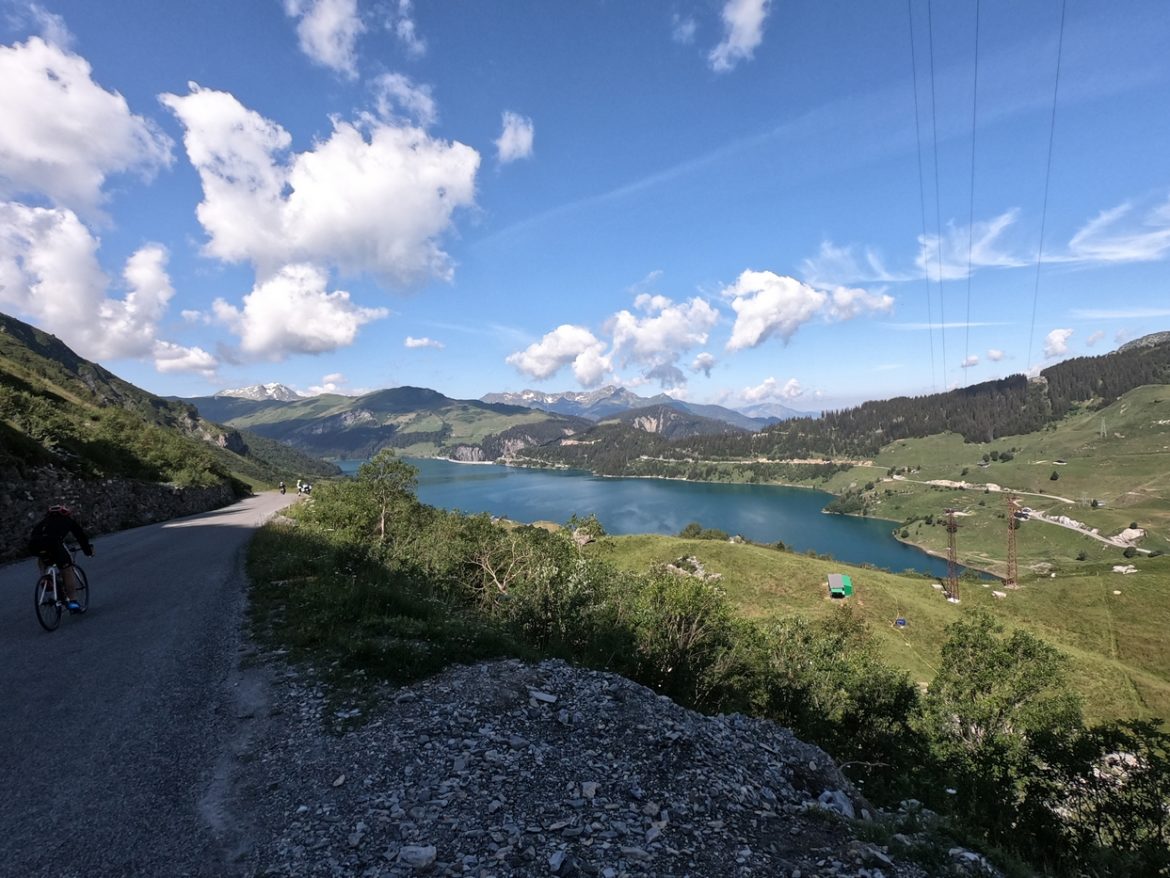 N’ayant pas l’entraînement pour réaliser l’ascension du col de Pré, je descends du côté des Chapieux pour remonter vers le Cormet Roselend côté Bourg Saint Maurice. Puis descente côté lac de Roseland. Je voulais pousser jusqu’au barrage mais la pente de la route me fait vite faire demi-tour.