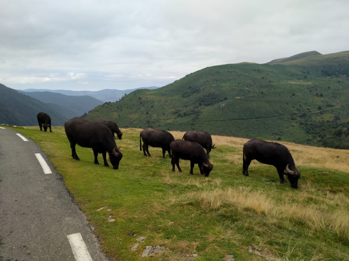On tourne un peu tôt dans Tarascon, ce qui nous fait prendre une autre série de cols que ceux prévus, mais la route nous mènera au bon endroit tout de même. Ça monte, tourne et descend parfois bien raide. On se fait une pause repas le midi avec des burgers maisons dans le camion, près d’un troupeau de bufflones en semi-liberté dans ce paturage traversé par la route. On aura droit à plusieurs traversées de troupeau dans la journée.