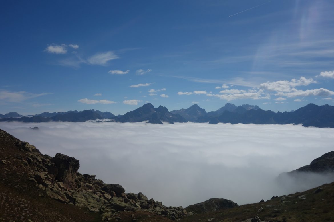 On poursuit, en passant entre les deux pics, en terminant dans un grand pierrier avant le col où l’on se pose au soleil en prévision du repas. On décide de monter (sans les sacs) au sommet du Peyreget pour avoir une vue panoramique. Elle est superbe avec la mer de brouillard. Le côté français est coincé en-dessous mais l’Espagne a l’air plus ensoleillé.