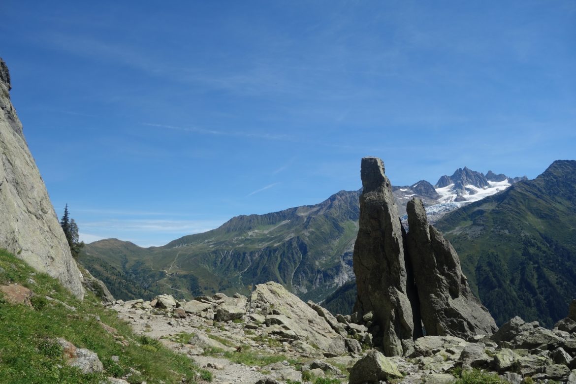 Je longe la voie ferrée en remontant vers le centre du village pour rejoindre le sentier qui m’emmène à l’Aiguillette d’Argentière. Vu le matériel que portent certaines personnes que je double, il doit y avoir des voies d’escalade dans le coin. Il y a en effet des petits points de couleur sur les falaises qui nous surplombent un peu plus haut. Et deux petites aiguilles se détachent bien du reste des rochers.