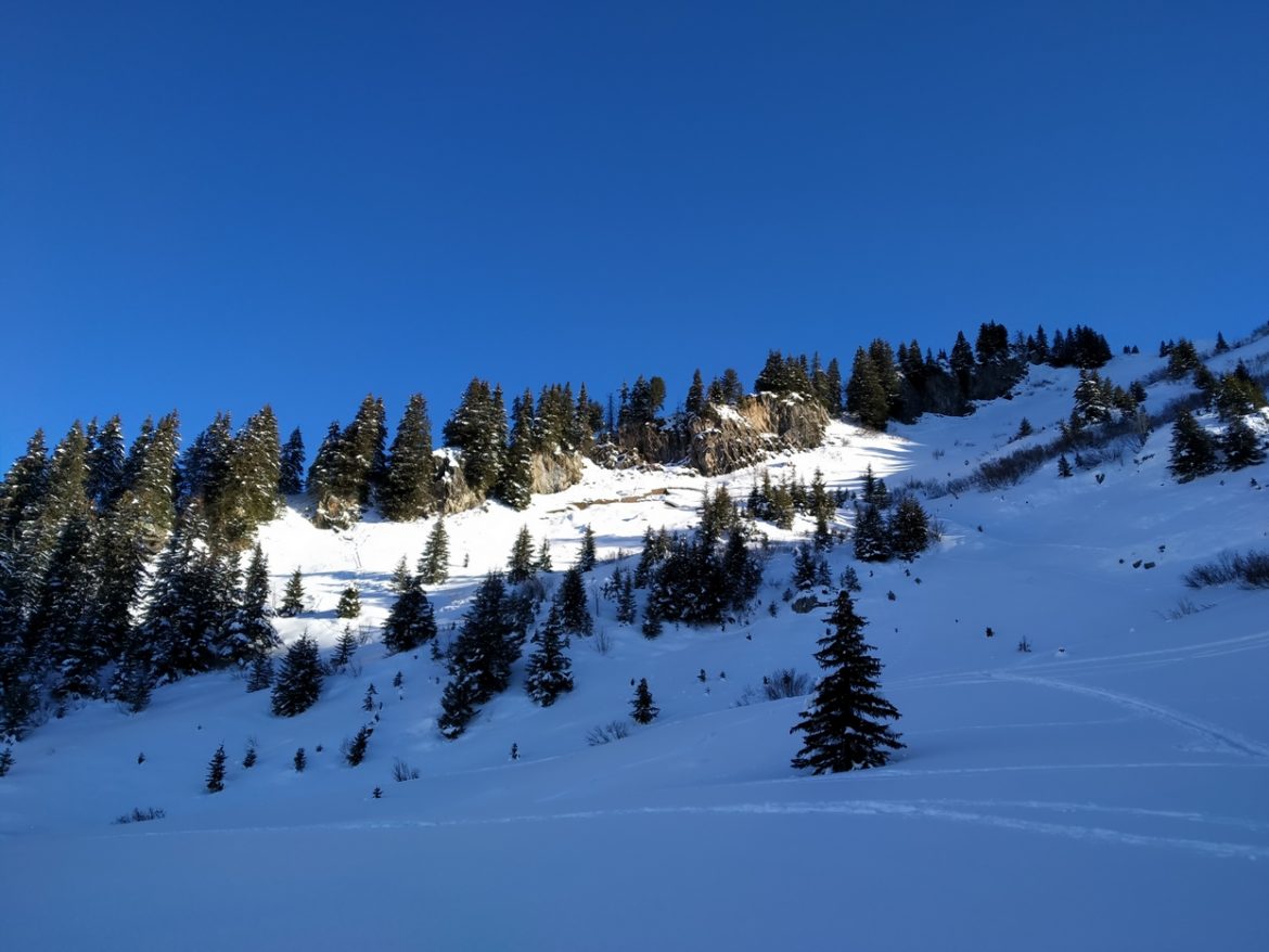Me voilà donc parti pour suivre la trace permettant d’accéder aux différentes combes des Aravis. La neige est bien tassée mais je garde tout de même les raquettes aux pieds maintenant que je les ai enfilées. Je suis ainsi la trace jusqu’au refuge de Bombardéllaz.