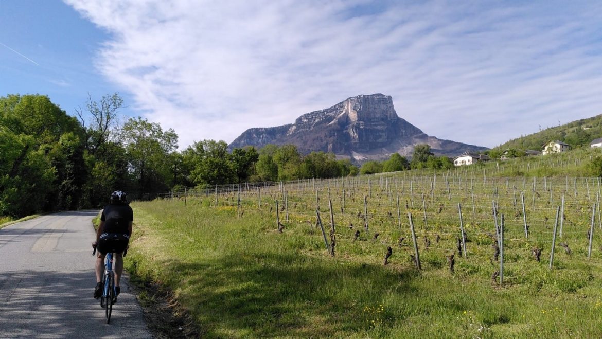 J’avais prévu de monter au col du Granier par la route derrière chez maman, avec peu de vue et tout à l’ombre le matin, il me conseille de passer par Saint Badolphe, via une route au milieu des vignes, avec vue imprenable sur les Bauges et les Belledonnes. C’est trop beau.