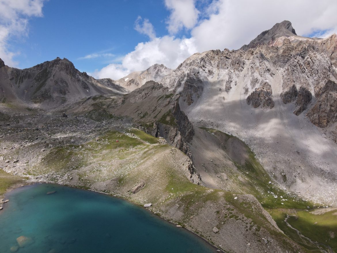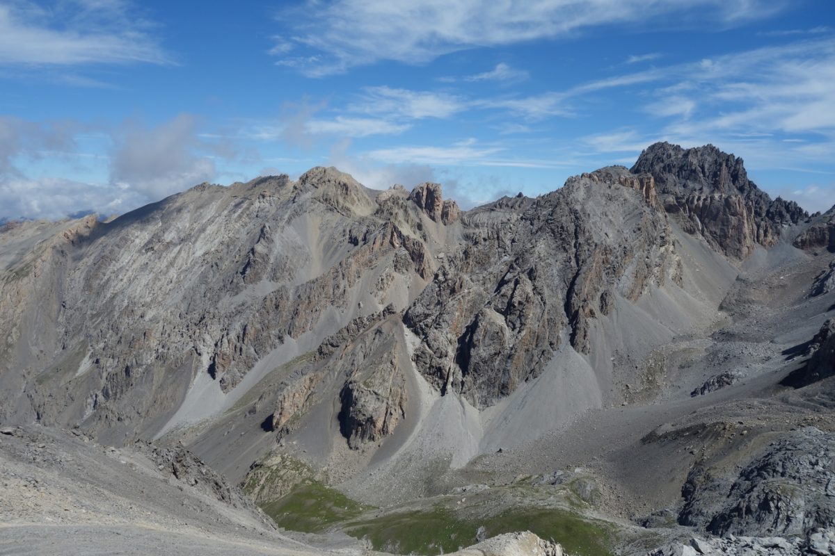 Le sommet est assez vaste pour s’y installer sans aucune crainte et prendre le temps d’admirer la vue : la Mortice avec le lac Vert en-dessous, le col, la Pointe d’Escreins et le val d’où je viens, le Pic de Font de Sancte, l’Aiguille de Chambeyron encore un dans les nuages. Juste superbe !