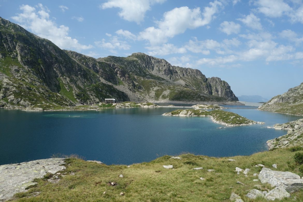 C’est une sacré vacherie à monter, en essayant de suivre le balisage pourtant fréquent. Les grosses pierres sont heureusement assez stables et sèches, ce qui limite les risques de se casser la figure, mais il faut rester prudent. Je suis bien entamé mais content d’arriver en haut, avec une vue plongeante sur le Lac du Cos.