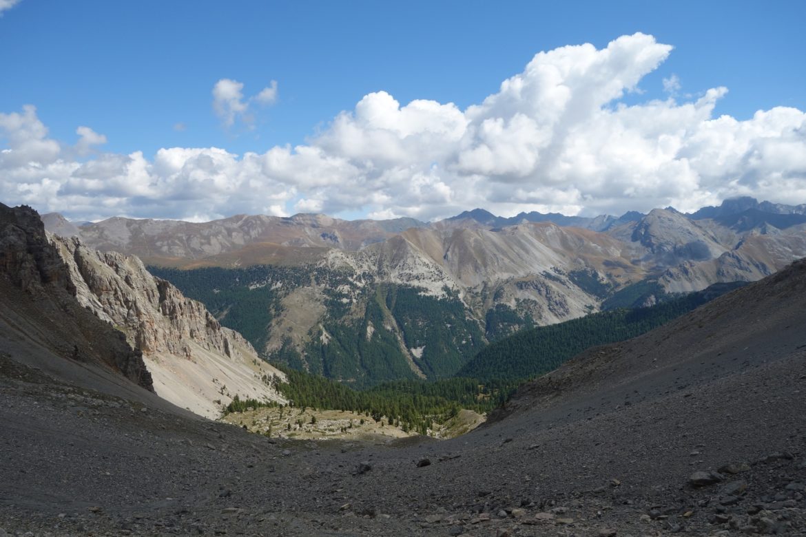 Je descends ensuite un petit peu de l’autre côté. Je quitte très vite le sentier pour suivre une sente au milieu du pierrier, marquée uniquement de cairns.