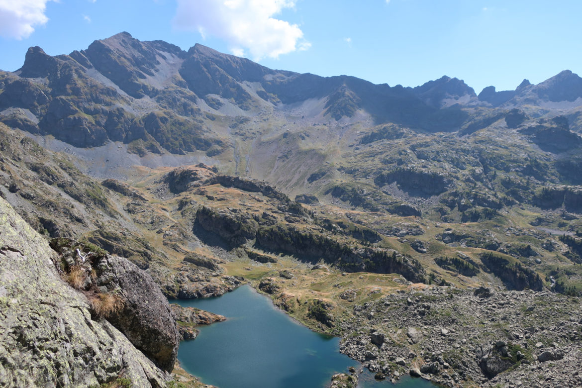 Des travaux de réhabilitation du chemin sont en cours entre le Grand Colon et le lac Merlat, on ne monte donc pas au sommet et passe un col (sans nom) un peu plus bas, qui nous offre la vue sur le premier des lacs du week-end. On commence également à déguster la spécialité du massif : les cailloux.