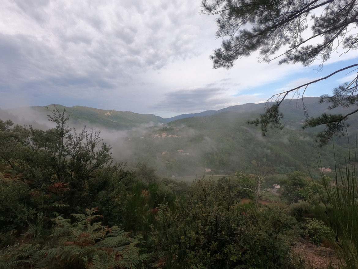 Nous allons avoir droit à tous types de terrains et de paysages : prairie, route, traversée de torrent, forêt calcinée, crapahute, piste, forêt de châtaigniers, de résineux, … C’est vraiment variés, on ne ne s’ennuie pas. La première boucle est plutôt tranquille pour étirer un peu le peloton et s’échauffer, la seconde offre plus de dénivelé, avec une belle ascension où il faut mettre les mains pour atteindre la Tour de Brison, avec une vue superbe sur les reliefs alentours. Ou encore une descente droit dans le pentu en forêt.