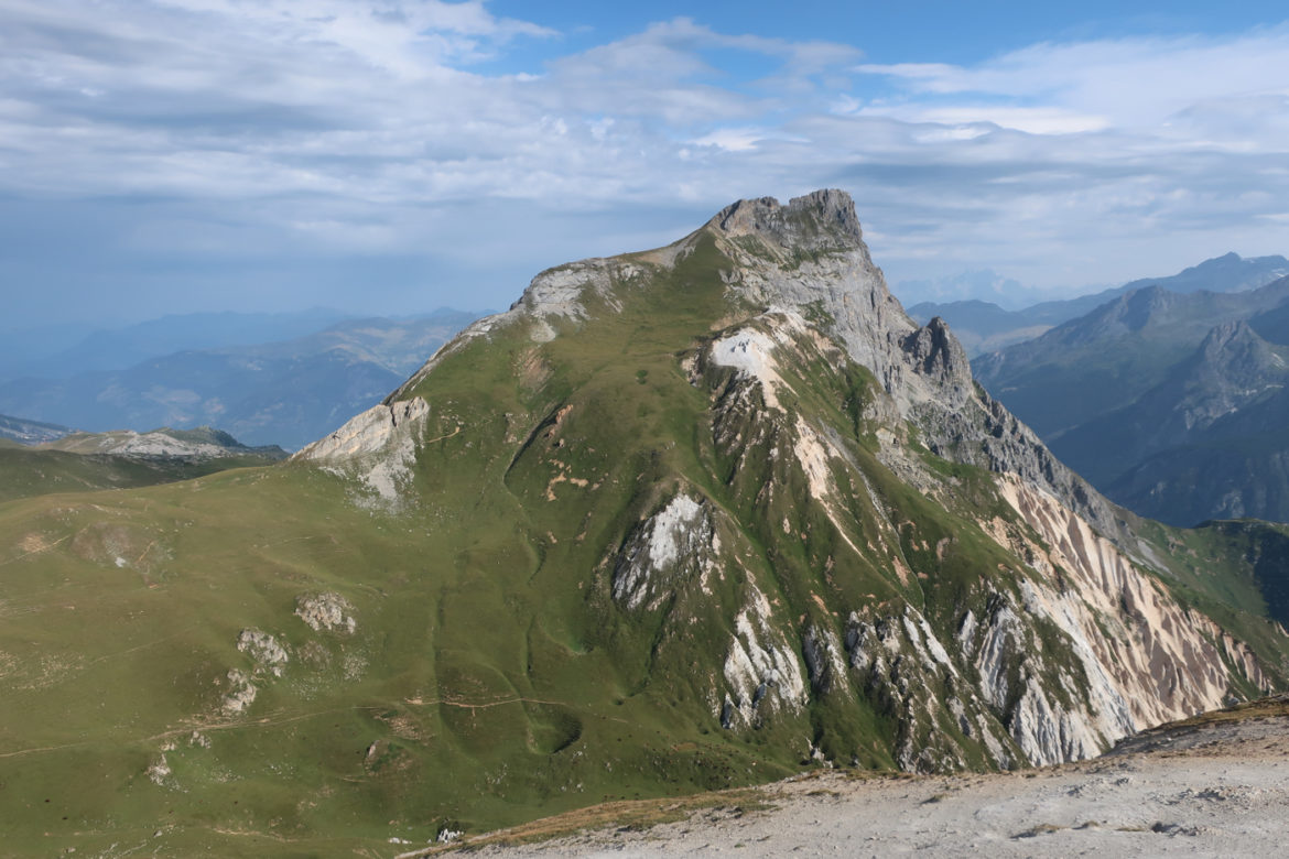 Je reprends la navette jusqu’aux Prioux, suit un peu la piste forestière avant de bifurquer dans l’autre sens sur une longue traversée montante. Ce doit être la seule fois où je passerai sous des arbres dans ce coin, avec quelques mélèzes par-ci par-là. On reprend les classiques lacets une fois arrivé à l’aplomb du col du Mône. Il y a pas mal de monde ici (comparativement aux autres jours), dont certains ont dû débuter tôt vu qu’ils en redescendent.