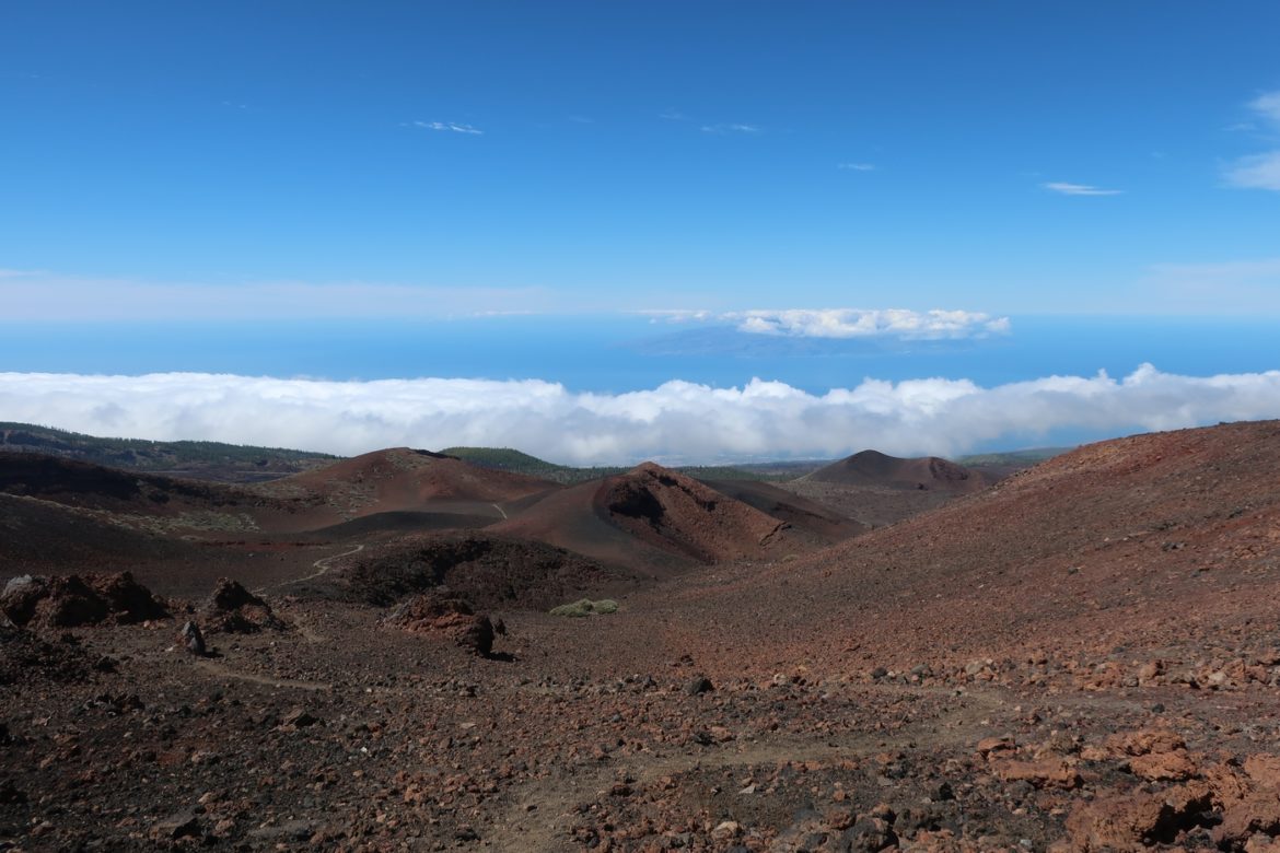 Je suis le sentier n°9 qui commence à s’élever doucement au milieu des mottes de végétation, et de quelques vieux cratères, les roches virant du brun au rougeâtre. Le Pico Viejo est toujours bien visible face à nous, et l’on peut bien voir le chemin parcouru lorsque l’on se retourne.