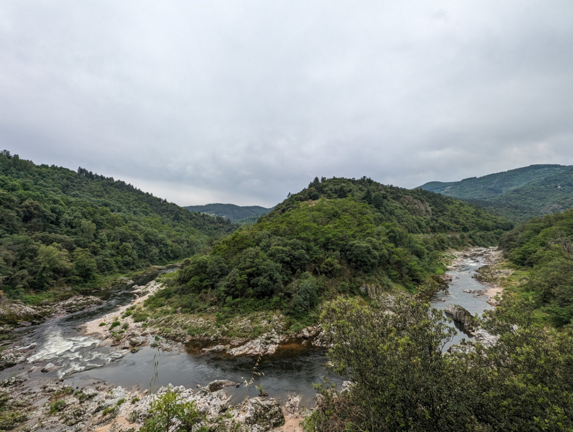 Un premier arrêt à Pont-de-Chevreuil, où nous attend une petite collation ainsi qu’une belle flotte de vélos. Les « animateurs » nous donnent quelques informations, puis nous voilà partis pour une dizaine de kilomètres sur la Dolce Via, dans le sens descendant. Ça me change de ma monture habituelle mais reste confortable. Pas trop besoin de pédaler, on profite de la vue sur les gorges de l’Eyrieux, en évitant les quelques flaques.