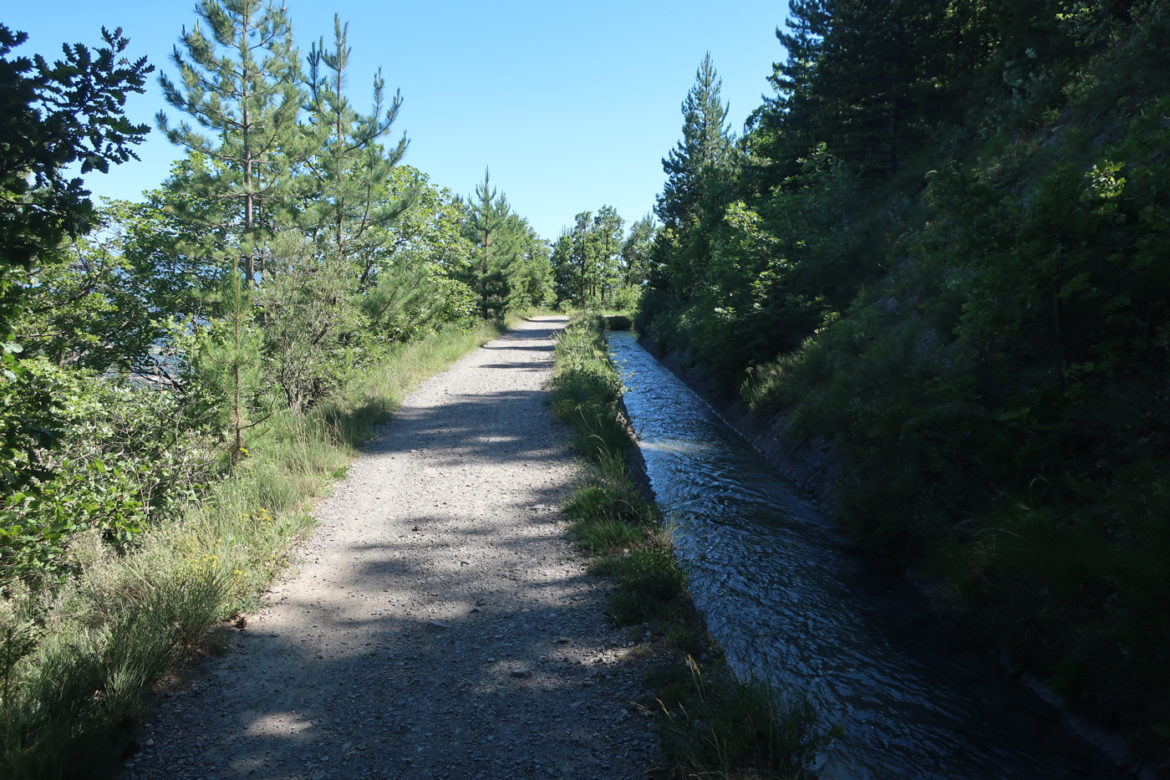 Le début de la semaine m’ayant bien entamé, je laisse de côté les belles mais grandes sorties en montagne que j’avais notées, et me content d’aller faire un petit tour à pied le long du canal de Gap. Il longe le flanc de la montagne au-dessus de la ville et un sentier permet de le longer.