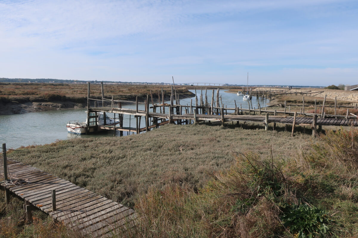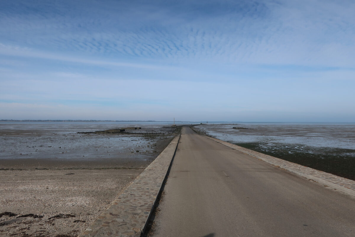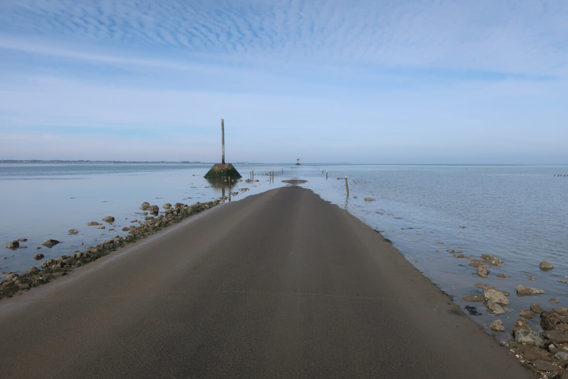 Je fais un petit détour pour voir le passage du Gois, une route permettant de rejoindre l’île de Noirmoutier à marée basse. Vu que je ne surveille pas ce type d’évènement, j’y arrive en marée montante, ce qui est tout aussi intéressant. Je peux observer l’eau recouvrir doucement l’asphalte.
